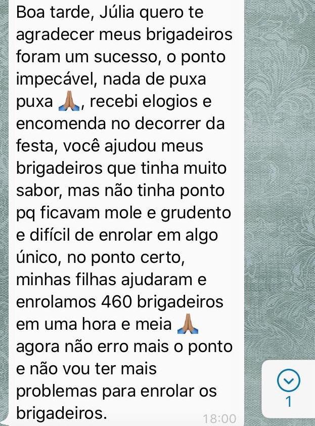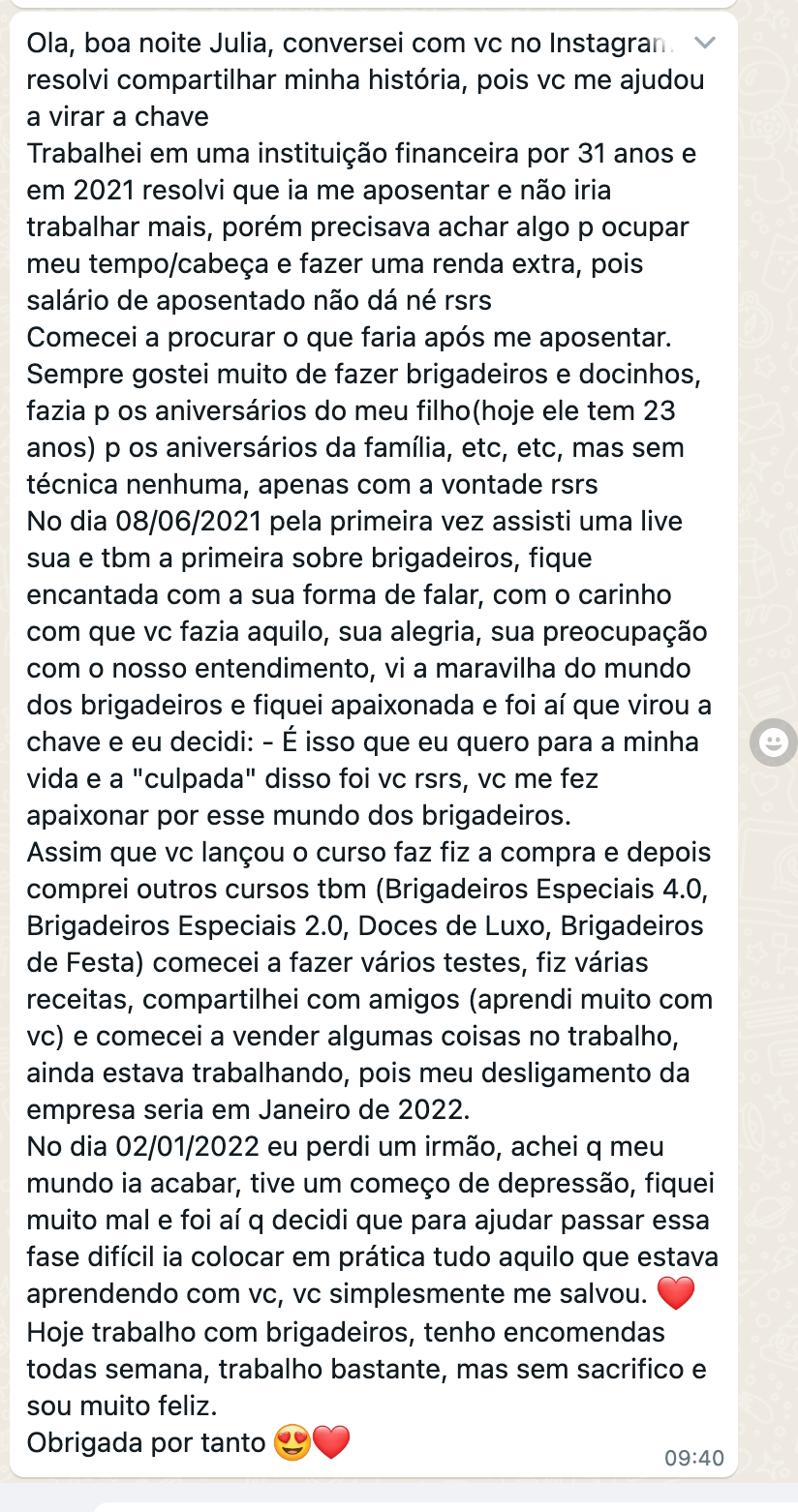 Olá Brigadeirudo e Brigadeiruda! Sou confeiteira há mais de 15 anos e especialista em Brigadeiros Especiais. Sou formada em Biomedicina e pós-graduada em Vigilância Sanitária de Alimentos pela USP-SP, e tenho especialidades em cursos de Doces de luxo, doces finos, brigadeiros e bolos. Minha paixão por transmitir conhecimento me levou a criar cursos e apostilas, e com eles Já impactei mais de 11 mil vidas em 12 países. Sou idealizadora da escola online de doces especiais Julia Nigro. Venha aprender comigo e transformar sua paixão em sucesso!"